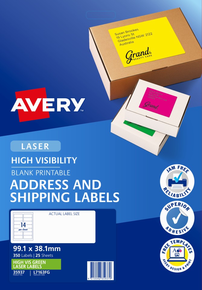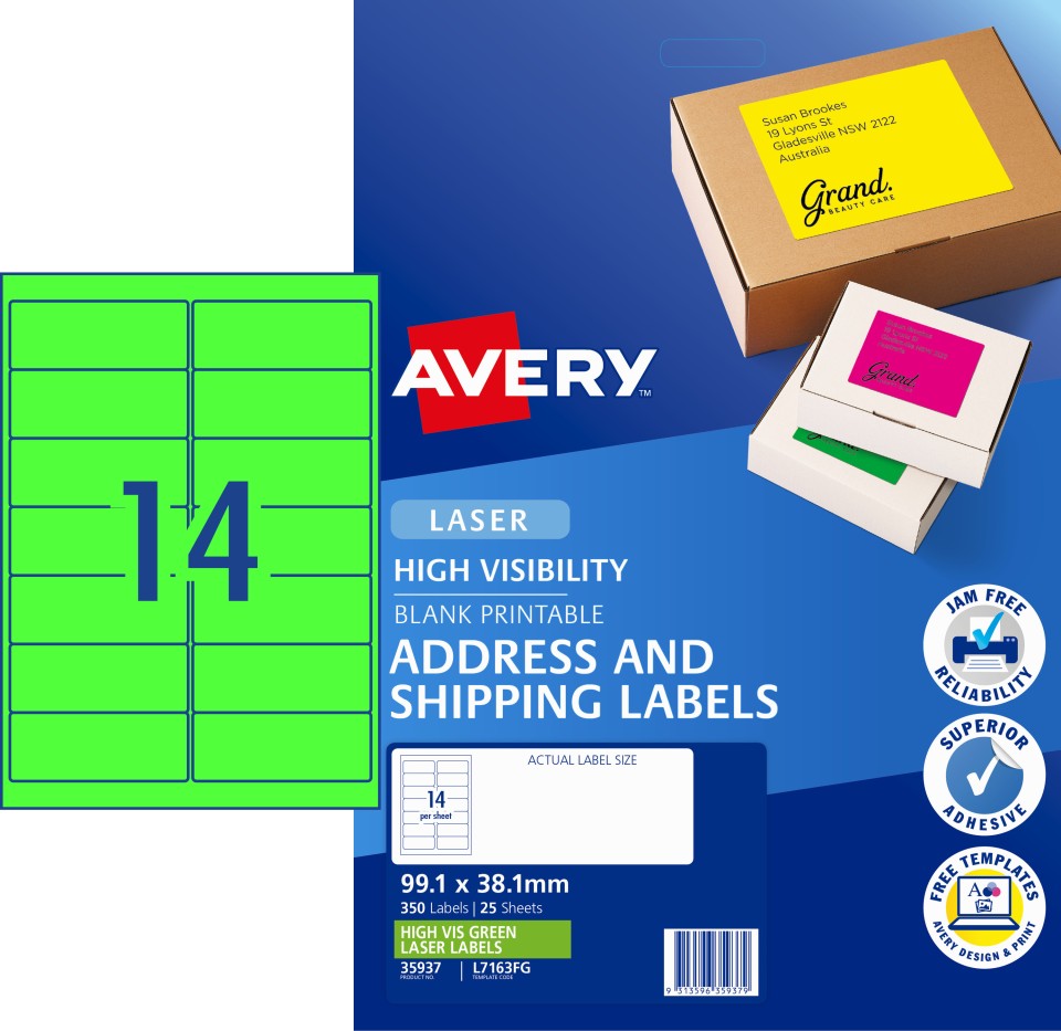 Avery Shipping Labels Laser High Vis 35937 L7163FG 99.1 x 38.1mm 14 Per Sheet Fluoro Green Pack 350