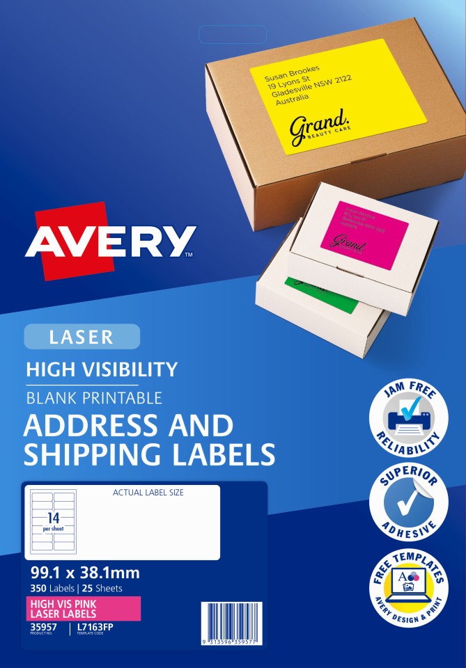 Avery Shipping Labels Laser High Vis 35957 L7163FP 99.1 x 38.1mm 14 Per Sheet Fluoro Pink Pack 350