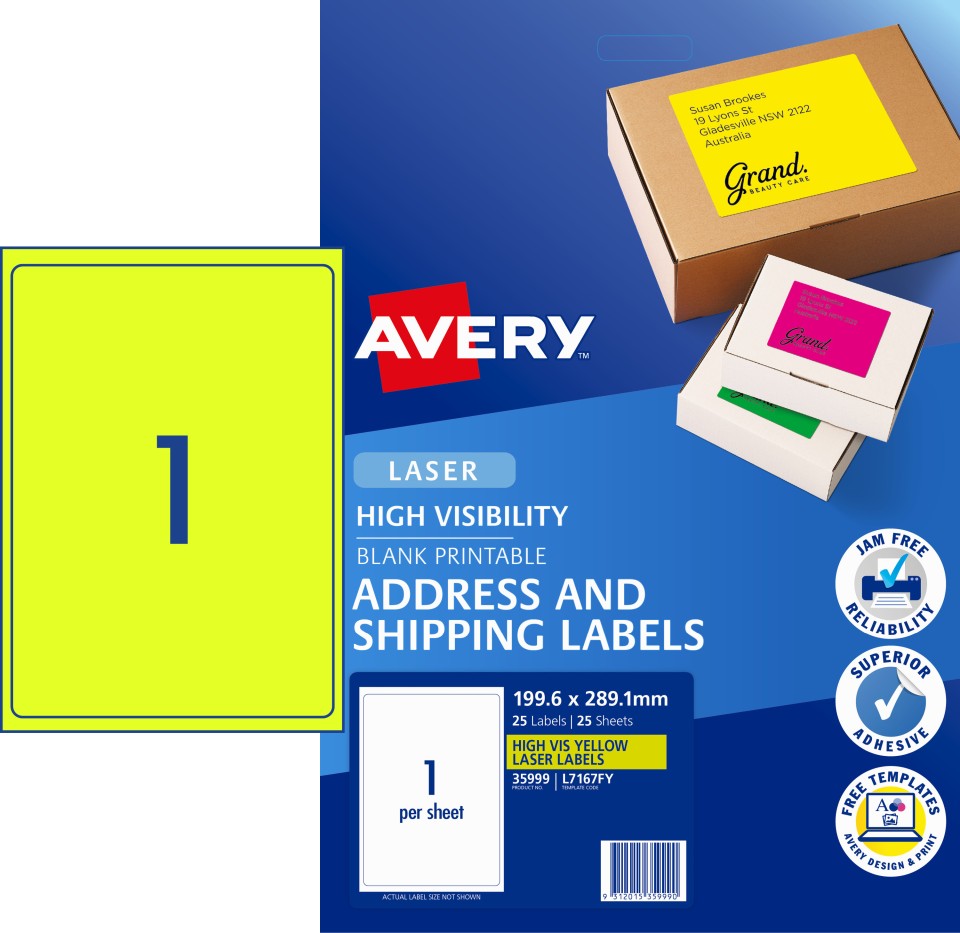 Avery Shipping Labels Laser High Vis 35999 L7167FY 199.6 x 289.1mm 1 Per Sheet Fluoro Yellow Pack 25
