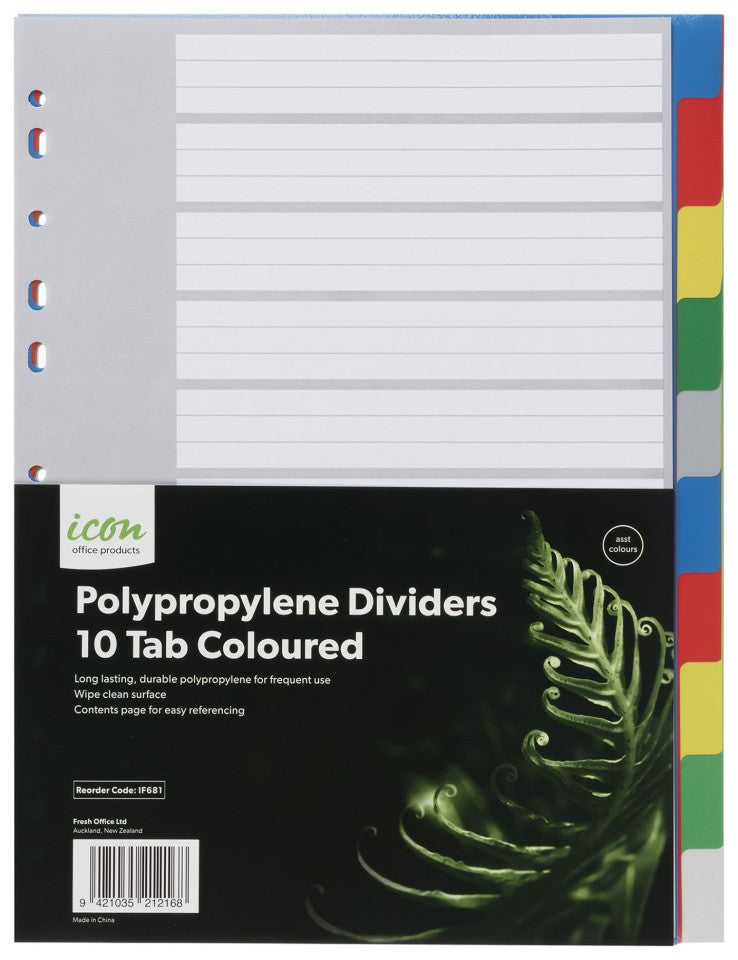 Product form Icon Dividers Polypropylene 10 Tab A4 Coloured $2.20Excl. GST Made from lightweight yet strong plastic Multi-punched for use with all ring binders Waterproof and can be wiped clean Colour... Read more Read more SKU: 45164100 Quantity Add to cart This item is a recurring or deferred purchase. By continuing, I agree to the cancellation policy and authorize you to charge my payment method at the prices, frequency and dates listed on this page until my order is fulfilled or I cancel, if permitted. Share with your friends Share WhatsApp Deel Tweet Pin it Messenger Email